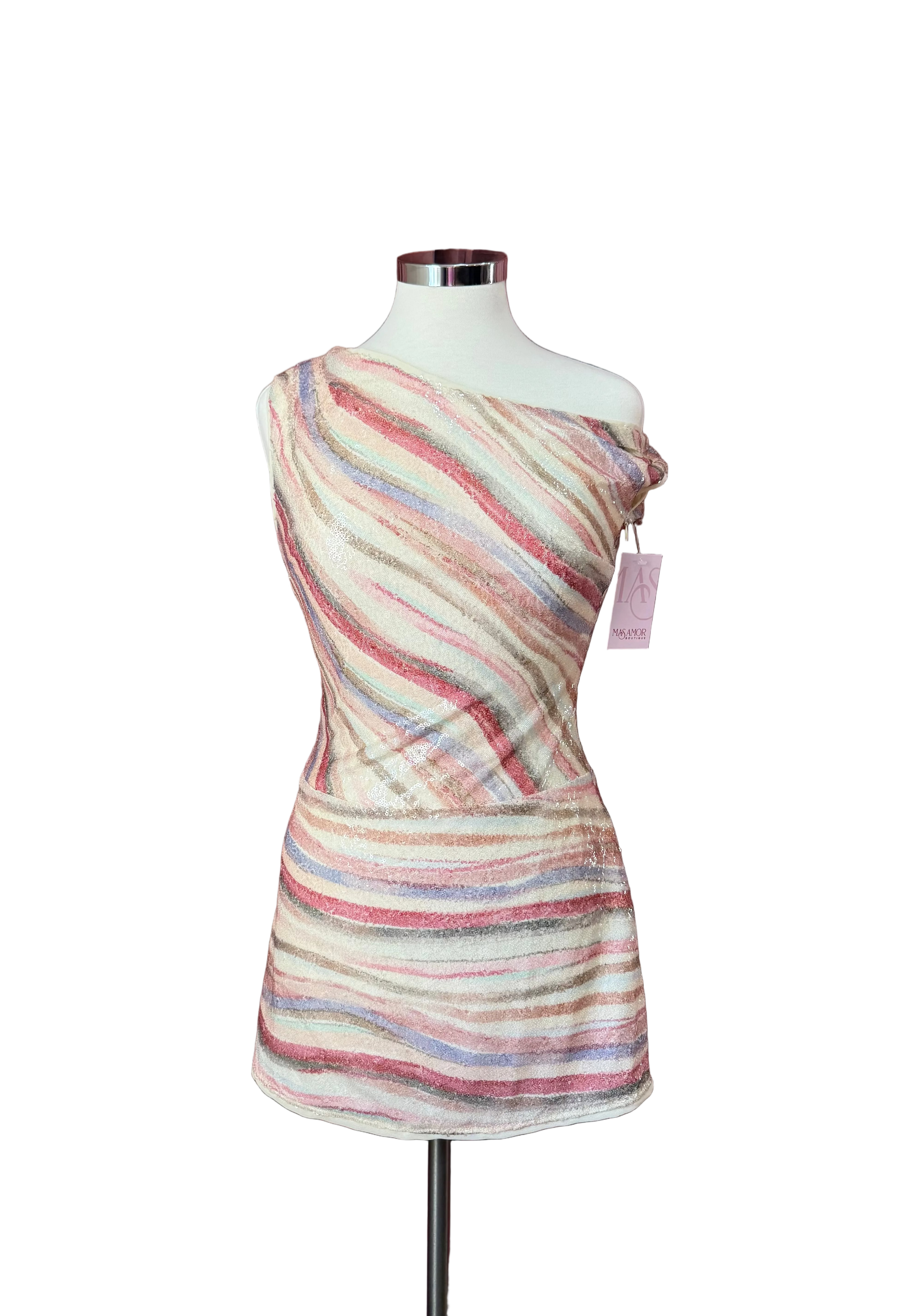 The Luz de Noche minidress features a chic asymmetric neckline and soft, sparkly pastel stripes that shimmer with every move. The body-hugging silhouette highlights your curves while the glittered fabric gives you a radiant, party-ready glow.