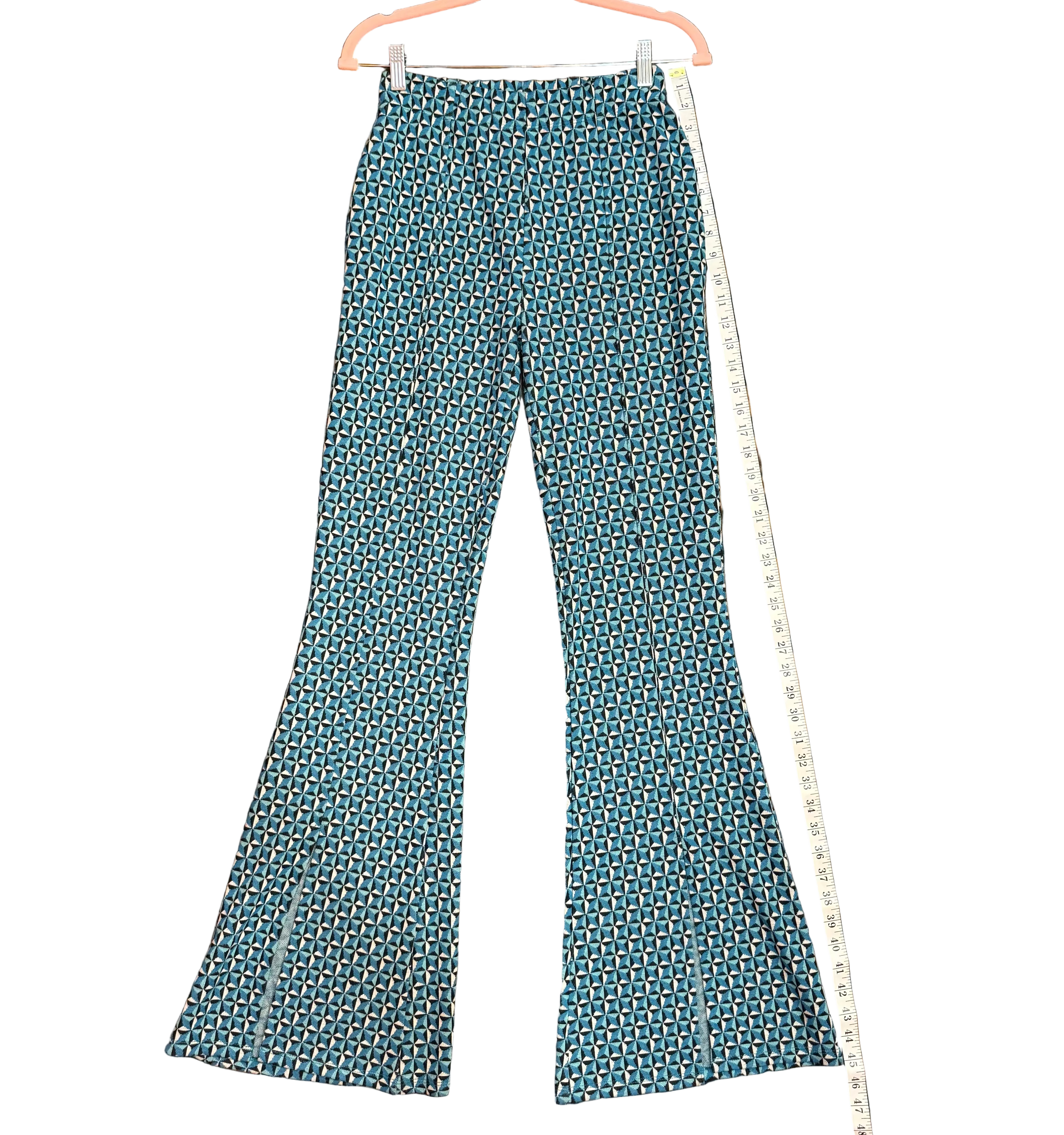 Retro-inspired statement in these Nasty Gal geometric flare pants. Designed in a striking teal and black all-over print, these high-waisted pants hug the waist and hips before flaring out into a flattering, leg-lengthening silhouette. The stretchy fabric moves with you, making them just as comfortable as they are eye-catching.