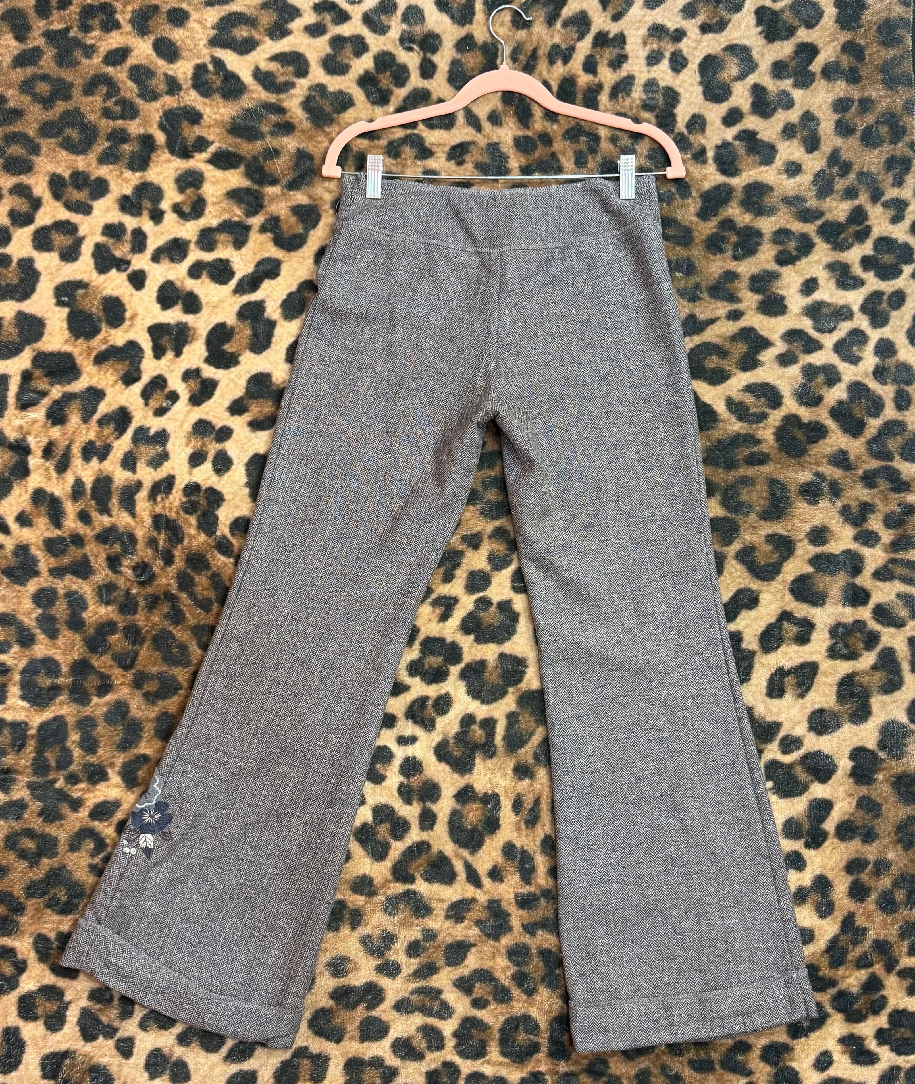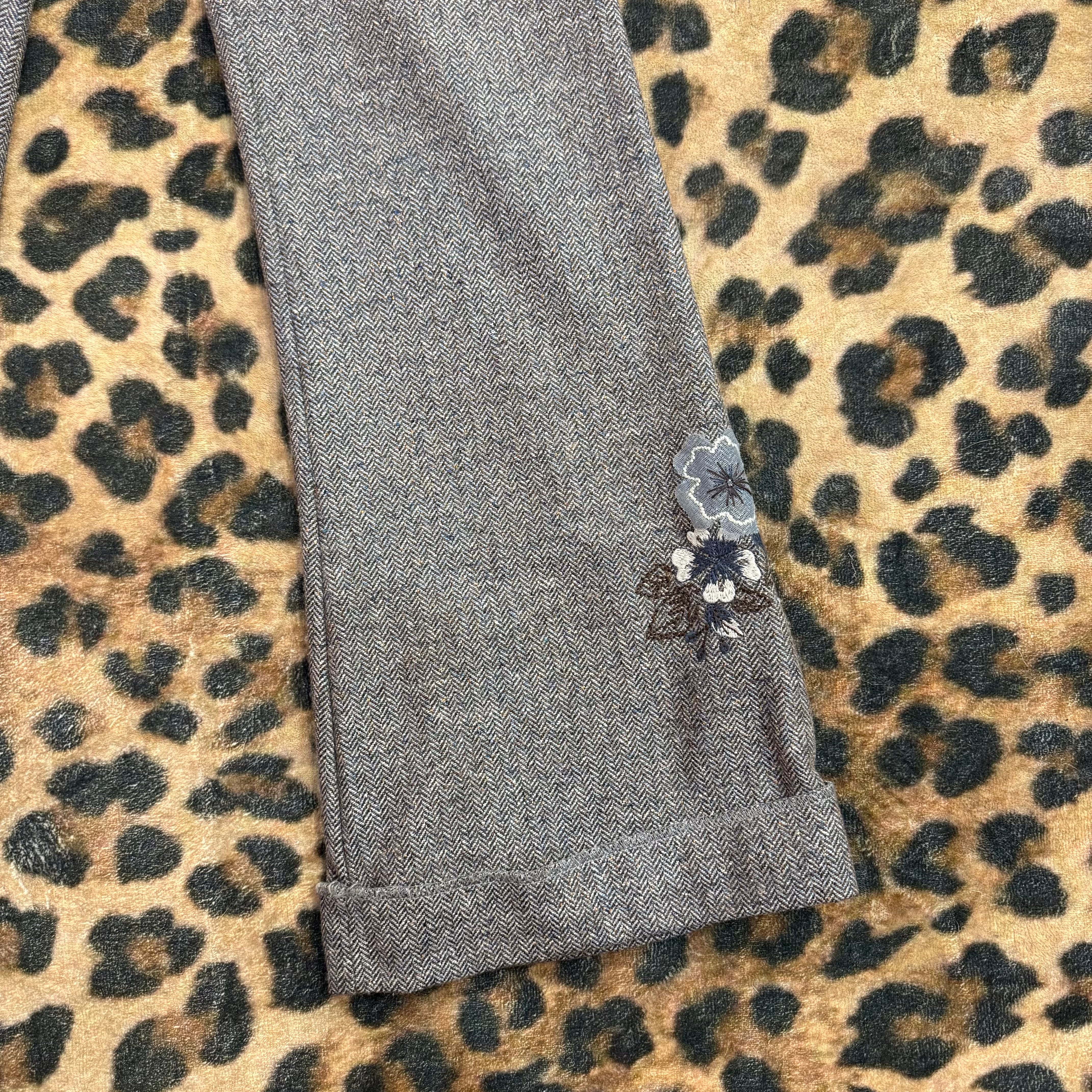 Shop tweed pants with floral embroidery. These high-waisted gray tweed pants feature a straight-leg fit, cuffed hem, front buckle detail, and delicate embroidered floral accents. A timeless yet feminine piece perfect for workwear, vintage-inspired outfits, or elevated everyday looks.